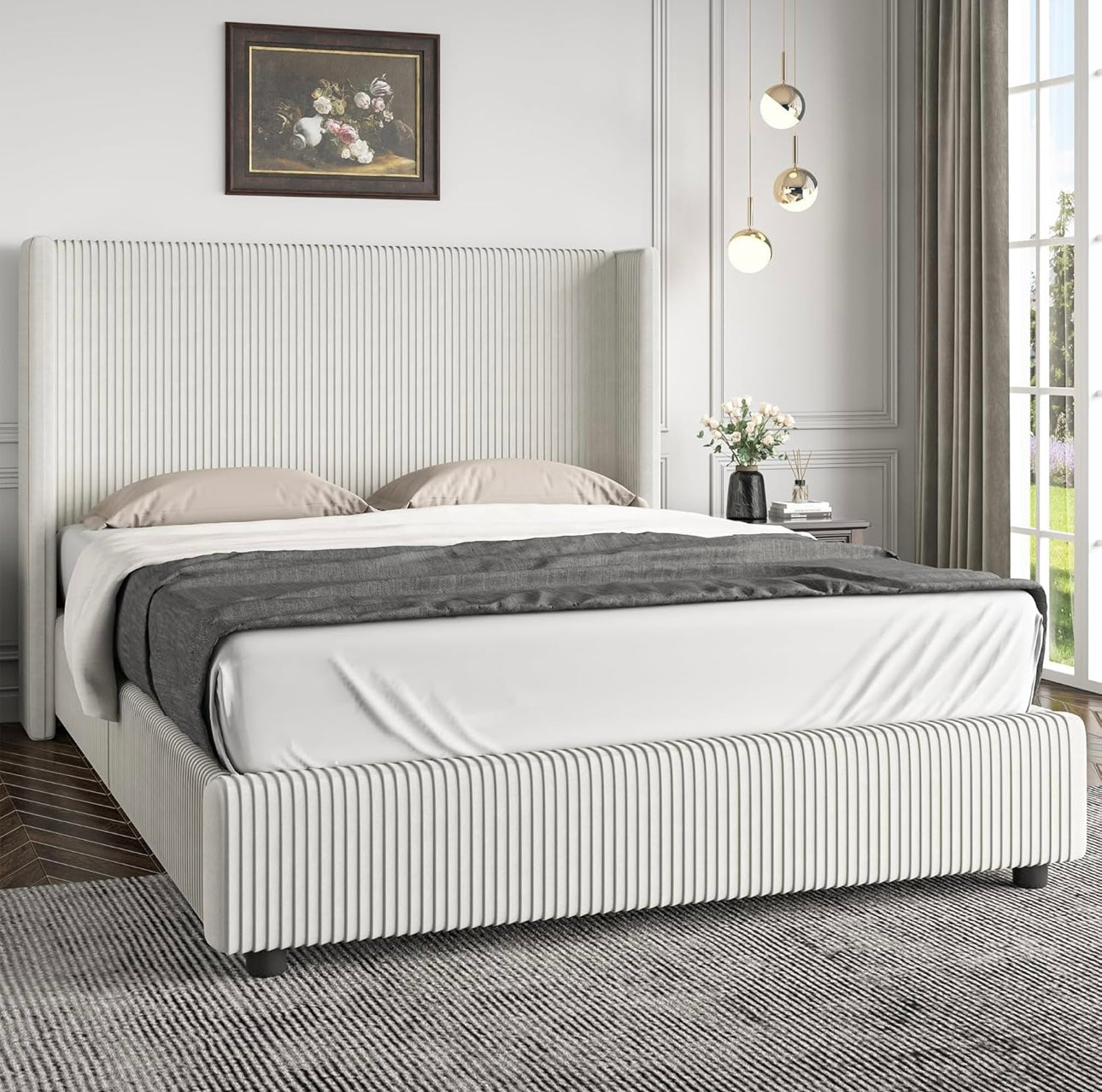 - Modern Stylish Style-Contemporary and elegant, the upholstered bed frame queen features a vertical channel wingback headboard in corduroy for quieter comfort and extra comfort and support, providing a luxurious foundation for your gorgeous bedroom